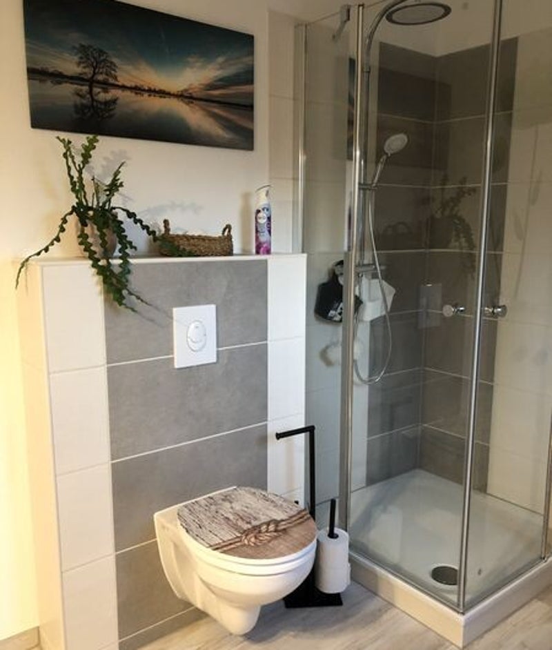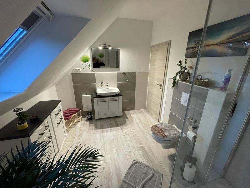 1 großzügiges Bad mit Regendusche, WC, Fön und kleinen Kosmetikartikeln